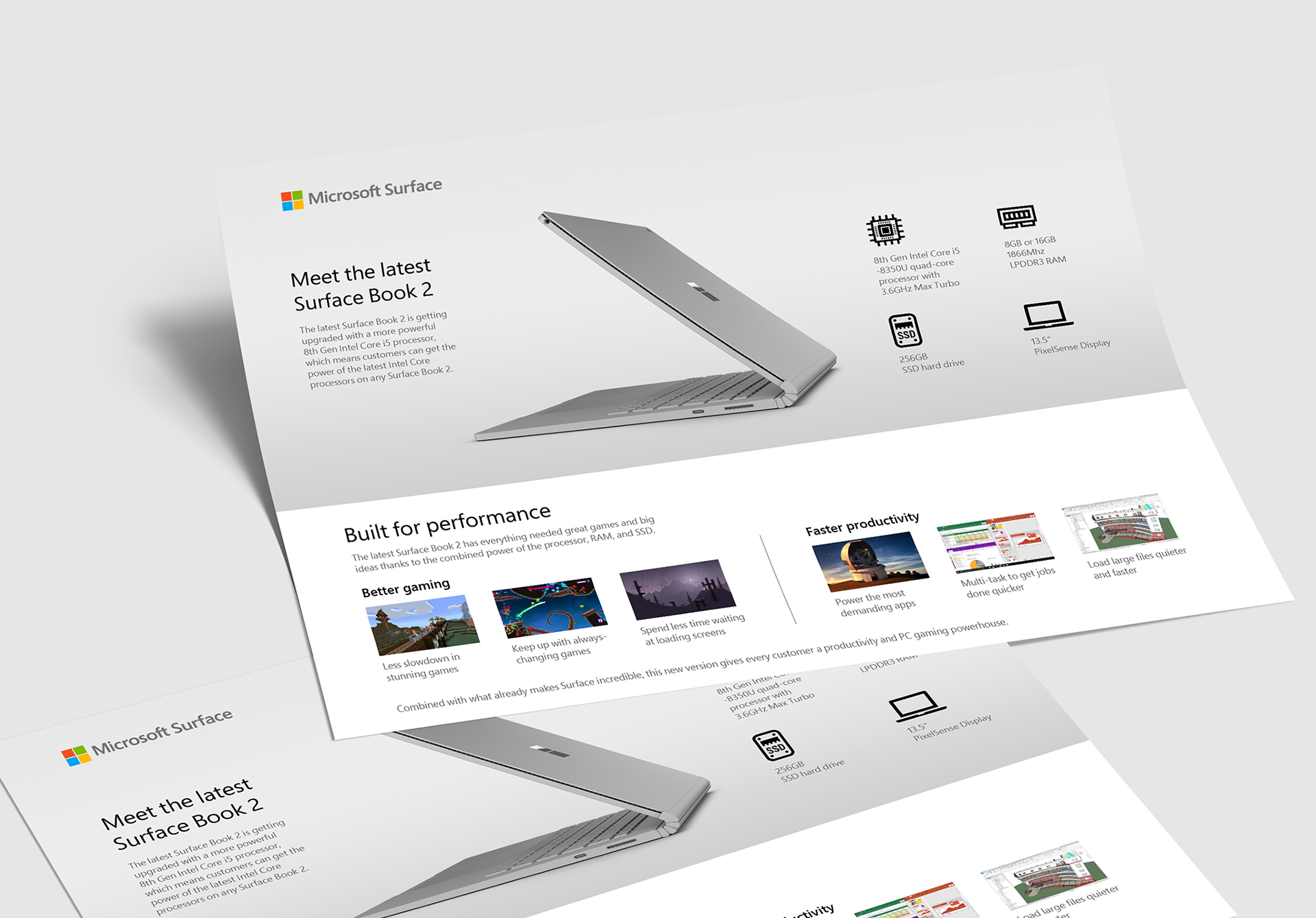 I designed these fact sheets using Microsoft Publisher and Adobe Illustrator for the Office & Surface Evangelism team. These materials were created to be printed and displayed at Microsoft retail stores worldwide. In addition to experiencing the products in-store, customers will have the opportunity to learn more about the products and campaigns through these clean, clear, and visually appealing fact sheets, all created in strict adherence to Microsoft’s brand guidelines.